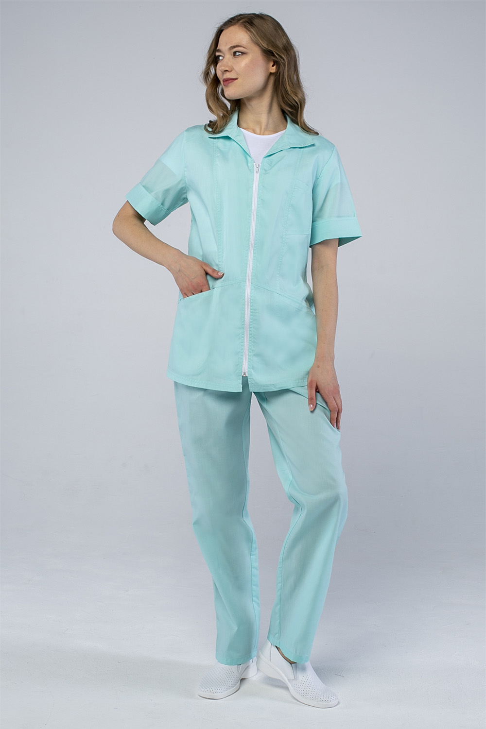 Костюм БЬЮТИС мятный сшит из качественной смесовой ткани «ТиСи», которая сочетает в себе воздухопроницаемость хлопка и практичность синтетического материала.