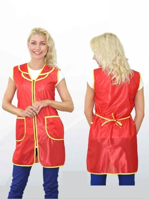 Сарафан женский укороченный прямого силуэта с центральной застежкой на молнию и горловиной с V-образным вырезом. Верхний срез боковых карманов и фигурные полуворотники декорированы контрастным кантом. Спинка без отделки, объем талии регулируется полупоясами. Все срезы сарафана обработаны износостойким нейлоновым кантом. Сарафан предназначен для защиты от общепроизводственных загрязнений.