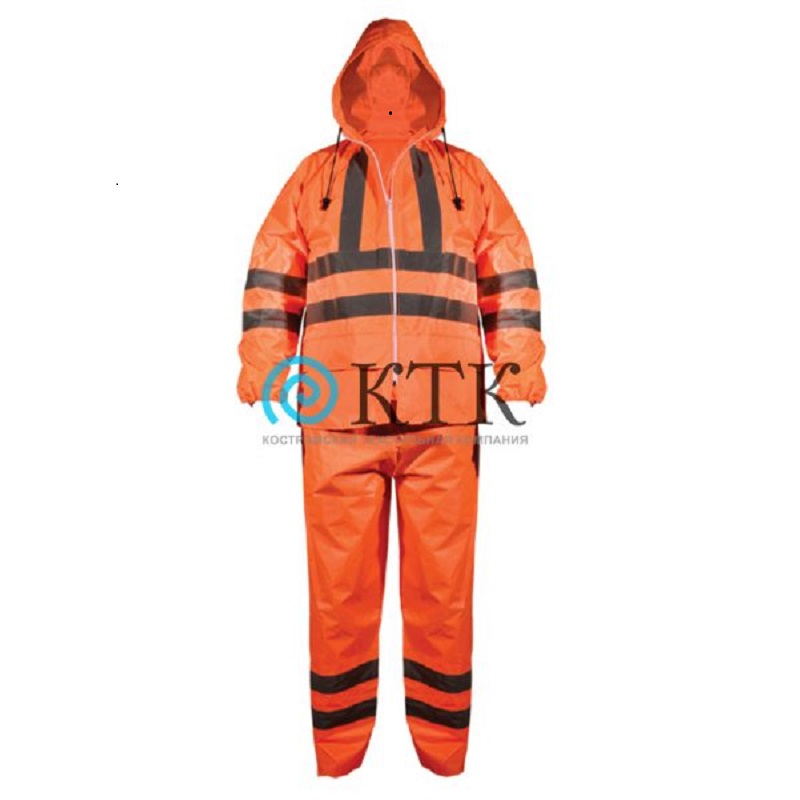 Костюм: куртка и брюки с застежкой на молнию с ветрозащитной планкой, имеет капюшон, накладные карманы с влагозащитными клапанами, прошитые и герметично проклееные швы, манжеты на рукавах. Спинка с кокеткой, отверстия для вентиляции, закрытыми клапаном. Объем капюшона регулируется по лицевому вырезу шнуром с наконечником. Световозвращающие поломы шириной 50 мм.