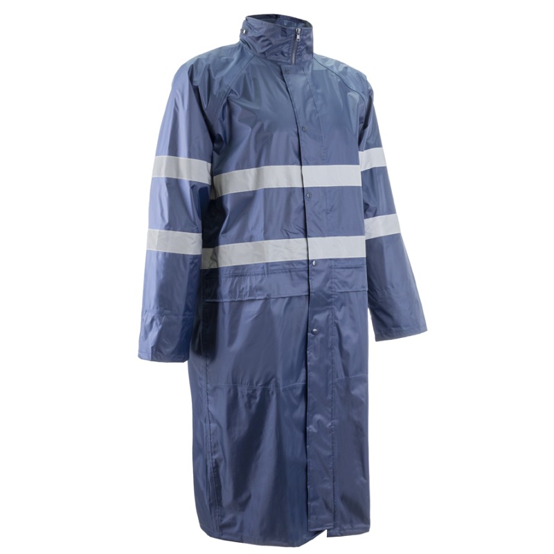 100% полиэстер 170T с покрытием из ПВХ 200 г/м2 + светоотражающие полоски + сетчатая подкладка 50 г/м2 Водонепроницаемость: 2000 мм Проклеенные швы Несъемный капюшон, встроенный в воротник на молнии + кулиска Воротник-стойка Центральная молния под клапаном на кнопках Рукава реглан Эластичная защита от ветра манжеты 2 кармана Вентилируемая спинка Вентиляционные отверстия под мышками Пришитые ленты EN 17353 тип B3