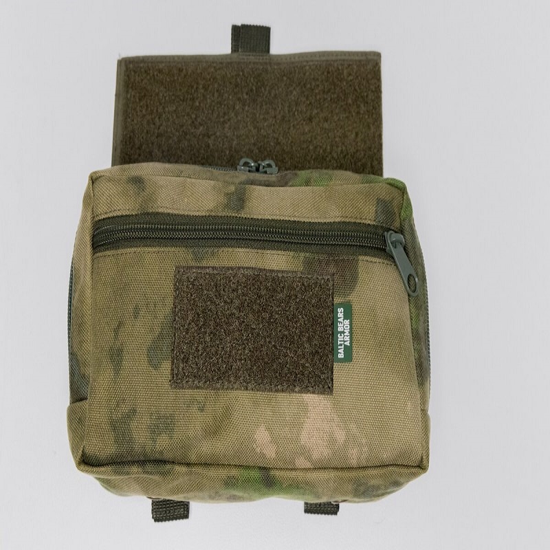 Вместительный утилитарный подсумок, с возможностью установки баллистической защиты во внутренний карман, что дает возможность использовать его, как противоосколочный модуль (например: защита живота). Имеет 2 способа фиксации: стропы молле и велкро, а так же 2 отдела для размещения всего необходимого. В большом отделе дополнительно внедрена 50 мм башмачная резинка для фиксации мелочи в виде батареек, ампул и т.д. на усмотрение пользователя.