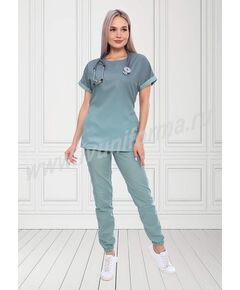 Современный костюм в спортивном стиле, состоящий из куртки и брюк. Куртка полуприлегающего силуэта, с округлым вырезом горловины и спущенным цельнокроеным рукавом. В нижней части полочки два внутренних боковых кармана. Отрезной пояс из эластичной тесьмы на спинке комфортно формирует линию талии,...