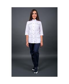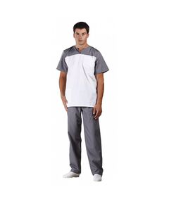 Стильный костюм сшит из смесовой ткани белого и серого цвета сшит по ГОСТу. • Свободный прямой крой обеспечивает комфорт во время работы. • Воротник с U-образным вырезом и центральным разрезом удобен при надевании блузы. • Короткие втачные рукава не мешают во время выполнения различных...