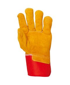 Перчатки изготовлены из спилка телячьей кожи желтого цвета и высококачественного красного хлопка. • Детали, которые больше всего подвержены нагрузкам, выполнены из спилка, это: внутренняя сторона ладони, пальцы, внутренняя сторона запястья (для защиты артерии). • Манжеты и внешняя сторона ладони...