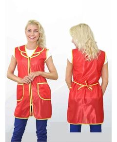 Фартук средней длины, перекидной. Спинка без отделки, полочка с отрезной кокеткой с округлым вырезом и симметричными фигурными накладными деталями из отделочной ткани. В нижней части полочки расположен вместительный карман с тремя отделениями. Объем фартука регулируется завязками-поясами, все...