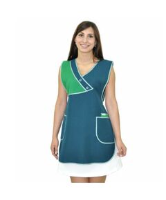 Фартук средней длины, перекидной. Спинка без отделки, полочка с отрезной асимметричной кокеткой из ткани контрастного цвета и накладной планкой с двумя пуговицами. В нижней части полочки расположены два вместительных боковых кармана, в один из которых вшит внутренний карман для мелких вещей....