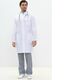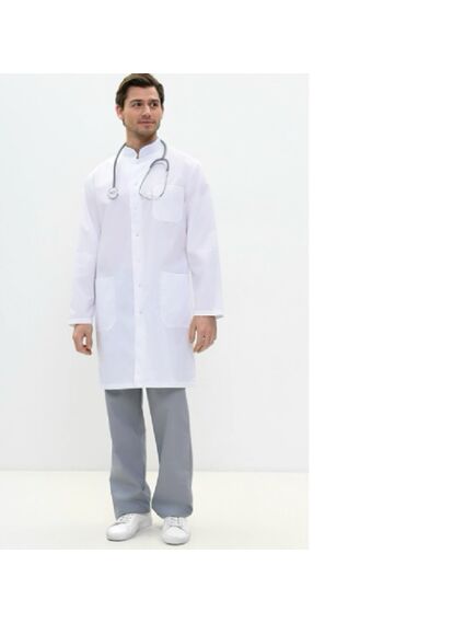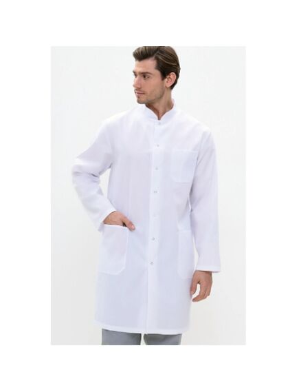 Современный медицинский халат прямого силуэта с потайной застежкой на кнопки. Особый крой рукавов дает дополнительный комфорт в движении. В среднем шве спинки – шлица. Накладные карманы вместительные за счет своей конструкции, при этом держат форму, не провисают. Длина по среднему шву спинки 99 см Длина рукава 63,5 см