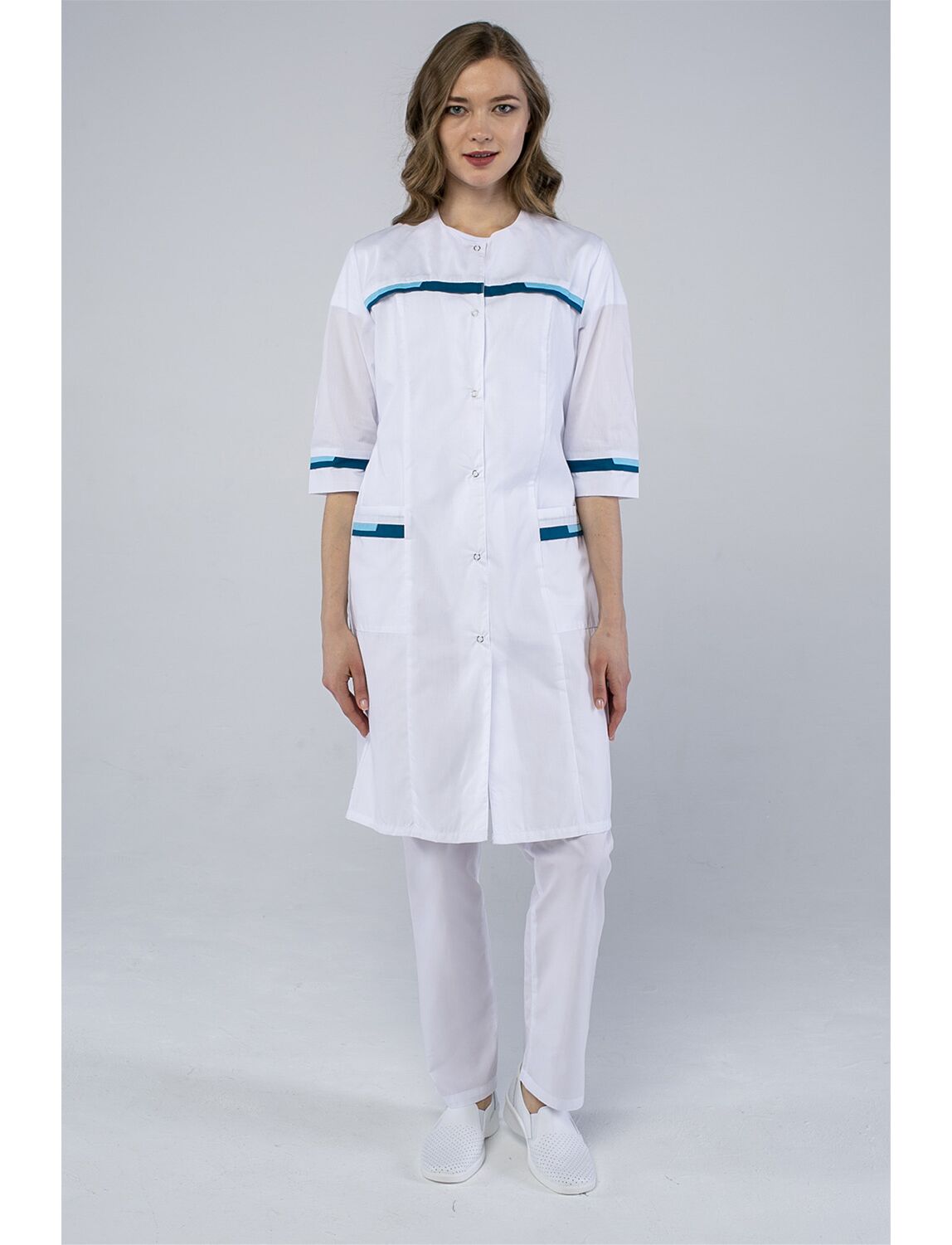 Халат ЛОТОС обеспечивает защиту от общепроизводственных загрязнений согласно ГОСТу и при этом отличается стильным современным дизайном. Особенности кроя: • полуприлегающий силуэт подчеркивает фигуру и при этом не сковывает движения, • центральная застежка на кнопках позволяет быстро надевать халат, • U-образный вырез удобен не только во время ношения, но и во время глажки, • рукав 3/4 не мешает и не пачкается во время работы, • вместительные боковые карманы позволят всегда держать необходимые мелочи под рукой, • пояс регулируется по талии – это позволяет подогнать посадку и обеспечить комфорт, • стильный декоративный кант контрастного цвета по кокетке и рукавам смотрится эффектно. Ткань, из которой сшит халат, на 65% состоит из полиэфира и на 35% из хлопка. Такое соотношение придает ей устойчивость к износу и долговечность в сочетании с воздухопроницаемостью и гигиеничностью.