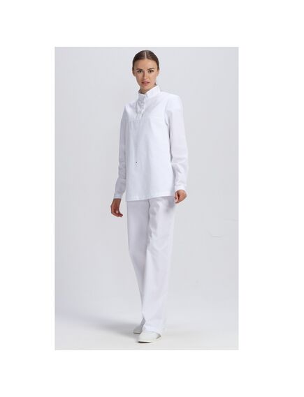 БЛУЗА: прямого силуэта длиной до середины бедра с боковыми разрезами по низу изделия цетральная застёжка с 2 потайными кнопками рукав длинный втачной, двухшовный по низу рукава установлены две кнопки для регулировки объема воротник - стойка с потайной кнопкой БРЮКИ: прямого силуэта пояс с внутренней резинкой на правой стороне расположен внутренний карман с застежкой на ленту контакт Разработано по ГОСТ Р 70231-2022 «Гигиена пищевой продукции. Одежда для работников производства пищевой продукции и общественного питания. Требования, основанные на принципах ХАССП»