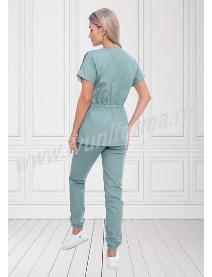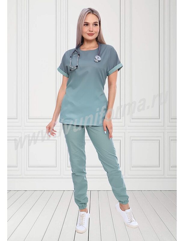 Современный костюм в спортивном стиле, состоящий из куртки и брюк. Куртка полуприлегающего силуэта, с округлым вырезом горловины и спущенным цельнокроеным рукавом. В нижней части полочки два внутренних боковых кармана. Отрезной пояс из эластичной тесьмы на спинке комфортно формирует линию талии, не сковывая движения. Эффектный принт, создающий уникальный перелив цветов и оттенков, придает костюму таинственность и женственность. Брюки-джоггеры на резинке создают динамичный образ современного специалиста. Костюм предназначен для медицинских работников и персонала СПА салонов.