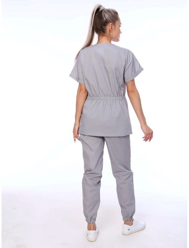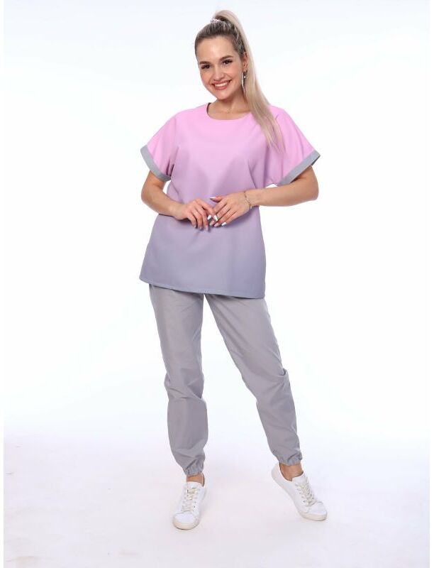 Современный костюм в спортивном стиле, состоящий из куртки и брюк. Куртка полуприлегающего силуэта, с округлым вырезом горловины и спущенным цельнокроеным рукавом. В нижней части полочки два внутренних боковых кармана. Отрезной пояс из эластичной тесьмы на спинке комфортно формирует линию талии, не сковывая движения. Эффектный принт, создающий уникальный перелив цветов и оттенков, придает костюму таинственность и женственность. Брюки-джоггеры на резинке создают динамичный образ современного специалиста. Костюм предназначен для медицинских работников и персонала СПА салонов.