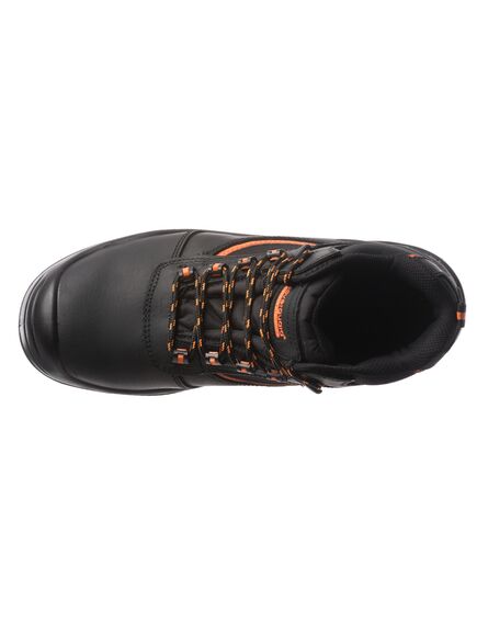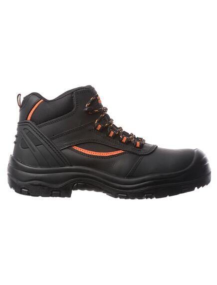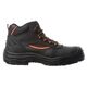 Стильные черные ботинки с оранжевыми вставками обладают высокой степенью защиты и подходят для работы даже в тяжелых производственных условиях. Благодаря качественным материалам и продуманному дизайну они надежно защитят от возможных травм при: • падении тяжелых предметов (весом до 20 кг с высоты до 1м) и сдавливании грузами весом до 1000 кг, • контакте подошвы с маслами, бензином, кислотами и щелочами, • скольжении по влажным керамическим и стальным покрытиям, • ударах силой до 20 Дж в области пятки (сила удара отбойного молотка при разрушении бетонной кладки), • воздействии статического электричества, • при опасности прокола подошвы. Верх ботинок из натуральной кожи с водостойкой пропиткой. Внутренняя подкладка - из мягкой сетки. Эти материалы обеспечивают воздухообмен, поэтому ногам в такой обуви комфортно на протяжении всего рабочего дня.