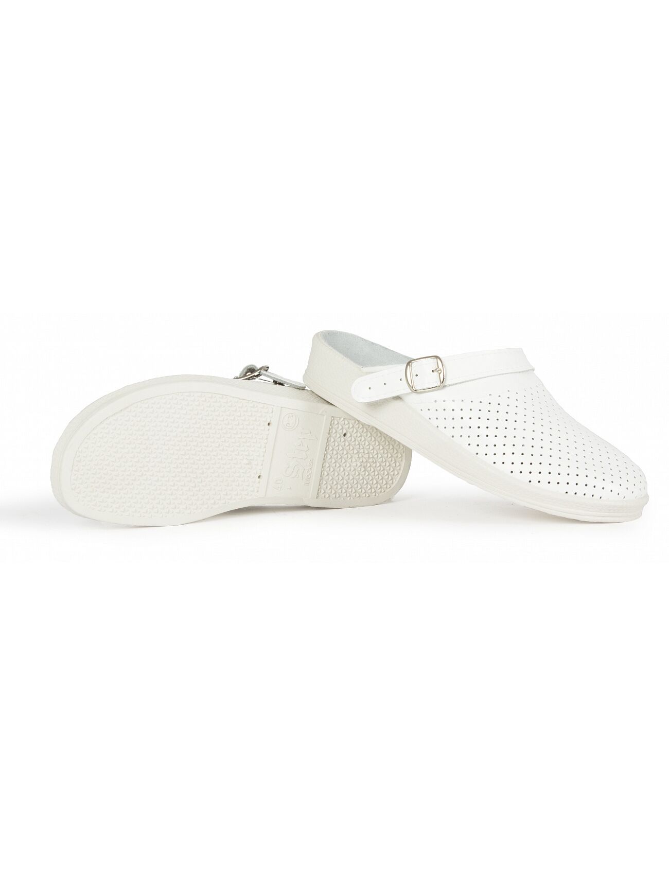 Верх этой модели выполнен из натуральной белой кожи с перфорацией: в них ноги дышат и не потеют в течение всего дня. Поворотный ремешок фиксирует обувь на ноге, чтобы она сидела плотно, не соскальзывала и не натирала.