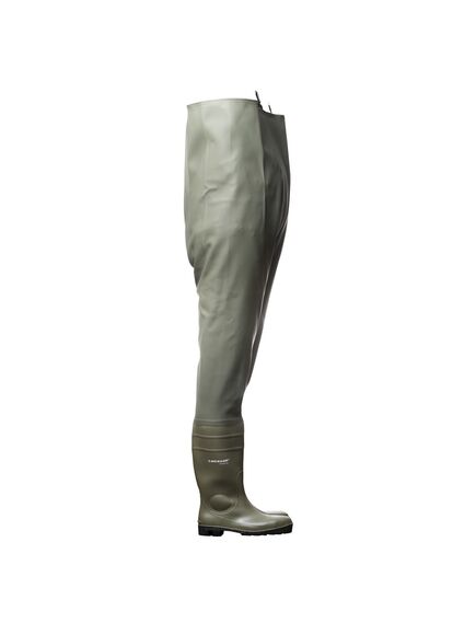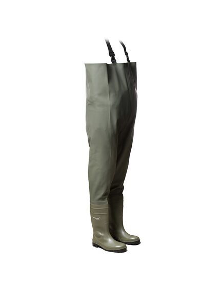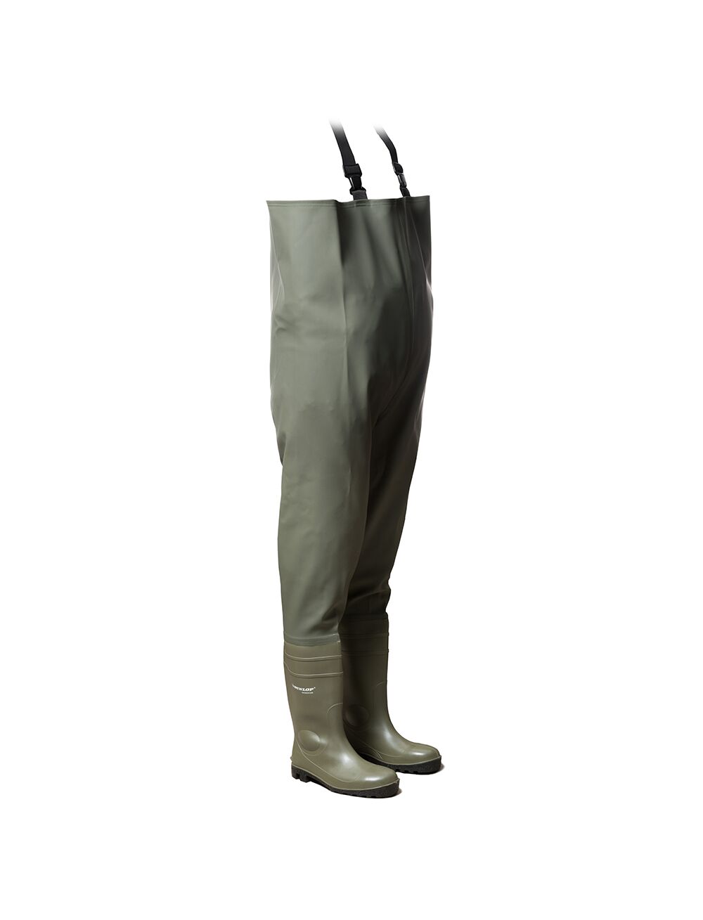 Рабочие кулики (защитный полукомбинезон до уровня груди) изготовлены португальской компанией DUNLOP из высококачественных материалов. • Наружный слой выполнен из поливинилхлорида (ПВХ) зеленого цвета, внутренний – из белого нейлона. Оба материала обладают высокой износостойкостью и водонепроницаемостью. • Носок и подошва сапог усилены металлическими вставками, которые защищают ноги от травм при ударах, порезах, падении тяжестей. • ПВХ устойчив к воздействию минеральных, растительных и животных масел и жиров, к различным химическим веществам, обладает антистатическими свойствами. • Подошва также отличается высоким сопротивлением к скольжению за счет особого рисунка протектора. Сапоги DUNLOP CHEST SAFETY – это 2 в 1: качество и защита в одной паре обуви.