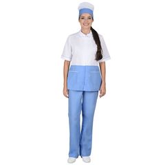 Костюм состоит из блузы, брюк и колпака. Блуза с центральной застежкой на молнию, в боковых швах центральные разрезы для удобства. Рукава и карманы с отделкой в виде канта контрастного цвета. Брюки прямого покроя на резинке. Колпак с фигурной отделкой.