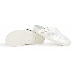 Верх этой модели выполнен из натуральной белой кожи с перфорацией: в них ноги дышат и не потеют в течение всего дня. Поворотный ремешок фиксирует обувь на ноге, чтобы она сидела плотно, не соскальзывала и не натирала. • Подошва из поливинлхлорида (ПВХ) с небольшой танкеткой обеспечивает...