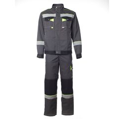 Нагрудные накладные карманы с фигурными клапанами на кнопках,нижние карманы в рельефных швах полочек. Усилительные накладки в области локтей. Куртка на поясе с фигурной линией низа по спинке. Полукомбинезон с различными многофункциональными карманами. Застежка гульфика на молнию и в правом...