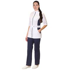 Костюм комбинированный из ткани двух цветов состоит из блузы белого цвета с отделкой и брюк тёмно-синего цвета. Блуза полуприлегающего силуэта с центральной застёжкой на молнию от горловины. Воротник стойка. С двумя внутренними карманами в рельефе. Рукава втачные, длиной 3/4. Брюки прямые на...