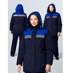 КУРТКА: - прямого силуэта с центральной застёжкой на тесьму – «молния» с одним утеплённым ветрозащитным клапаном, застёгивающиеся на ленту «контакт» и одной внутренней ветрозащитной планкой полочки и спинка с кокетками из отделочной ткани и светоотражающем кантом, входящим в шов притачивания...