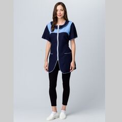 Халат женский прилегающего силуэта скомбинирован из тканей контрастных оттенков. На полочке центральная бортовая застежка на кнопки и два боковых кармана. Воротник-стойка, рукав втачной, короткий. Прилегание халата дополнительно регулируется поясом.