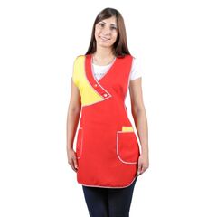 Фартук средней длины, перекидной. Спинка без отделки, полочка с отрезной асимметричной кокеткой из ткани контрастного цвета и накладной планкой с двумя пуговицами. В нижней части полочки расположены два вместительных боковых кармана, в один из которых вшит внутренний карман для мелких вещей....