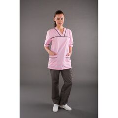 Костюм ИРИС обладает функциональностью спецодежды и стильным дизайном с приятным сочетанием цветов. Блуза розового цвета сшита в виде кимоно. По низу рукавов, полочки, краю горловины и по верхним краям карманов пришит декоративный кант серого цвета. Брюки серого цвета на поясе с эластичной...