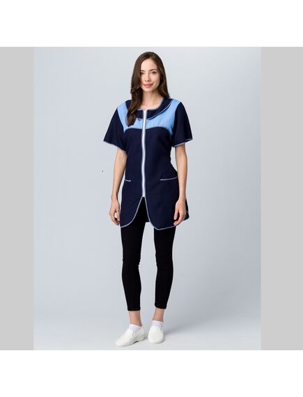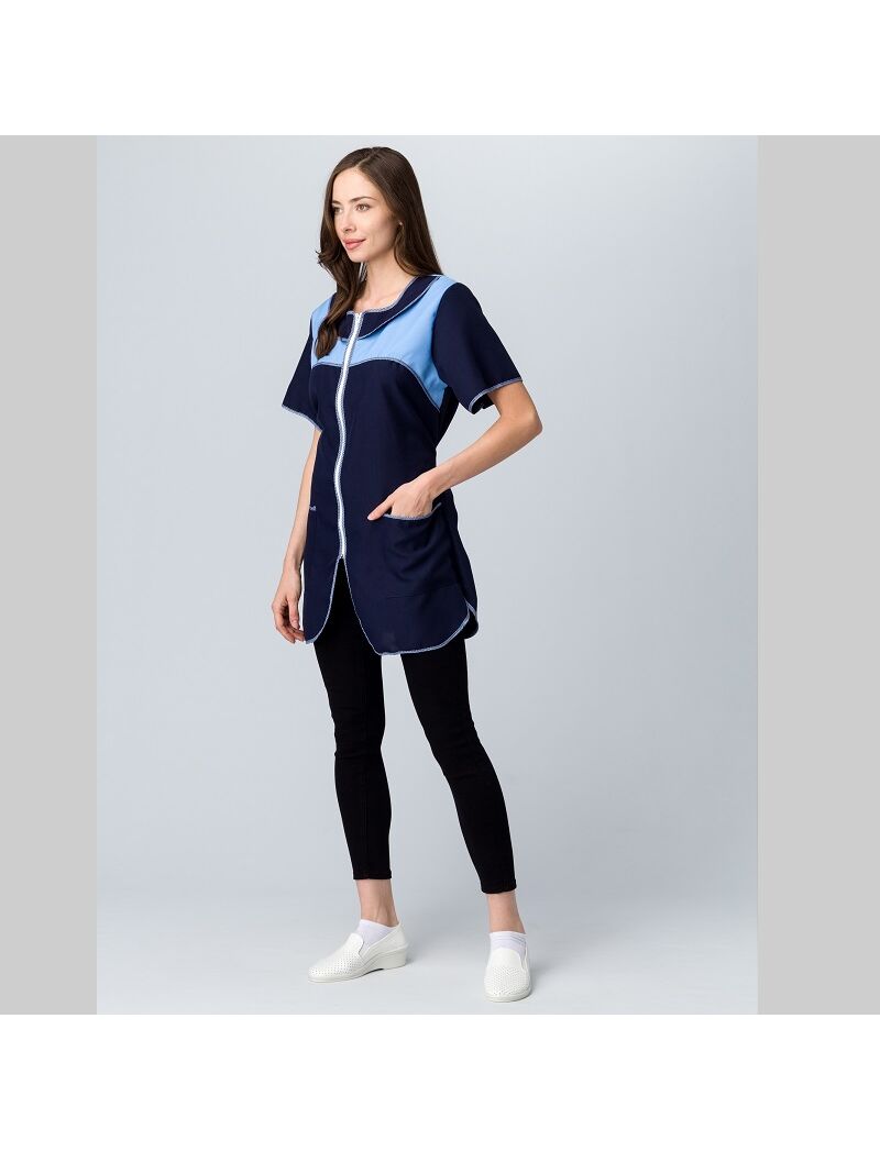 ХАЛАТ: - укороченный прямого силуэта с центральной застежкой на молнию - полочка с двумя нижними накладными карманами и разрезами по боковым швам - рукав короткий, втачной - отрезные кокетки на полочках и спинке выполнены из контрастной ткани - объем талии регулируется двумя завязывающимися полупоясами - все срезы халата обработаны капроновым кантом - для усиления прочности халата выполнено дополнительное усиление швов центральной застежки и карманов - предназначен для защиты от общепроизводственных загрязнений