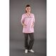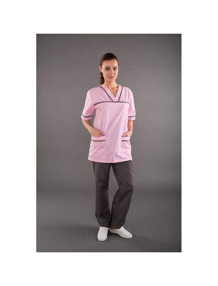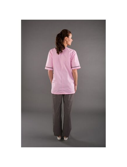 Костюм ИРИС обладает функциональностью спецодежды и стильным дизайном с приятным сочетанием цветов. Блуза розового цвета сшита в виде кимоно. По низу рукавов, полочки, краю горловины и по верхним краям карманов пришит декоративный кант серого цвета. Брюки серого цвета на поясе с эластичной тесьмой сшиты из такой же ткани, как и отделка на блузе. Материал, из которого изготовлен костюм – смесовая ткань «ТиСи». Ее свойства: • Хлопок – 35% • Полиэфир – 65 %, • Плотность – 130 г/м², • Водоотталкивающая пропитка. Материал «ТиСи» активно используется при изготовлении специальной одежды, так как обладает повышенной износоустойчивостью, пыленепроницаемостью, отлично сохраняет цвет и форму при длительной эксплуатации.