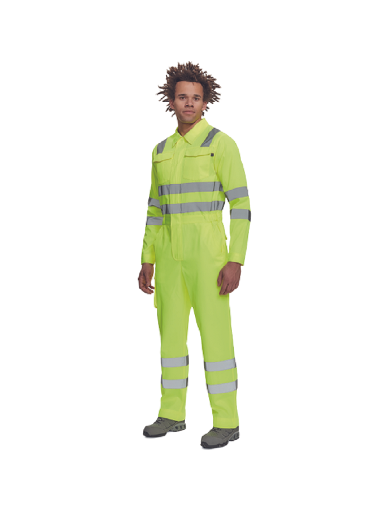 мужской легкий рабочий комбинезон HI-VIS со светоотражающими полосками • планка закрывается на молнию • 2 боковых кармана, 1 карман для монет • 1 многофункциональный карман на бедрах • 2 задних кармана, 2 нагрудных кармана с клапанами • эластичные детали со стороны талии • возможность увеличения длины штанин.