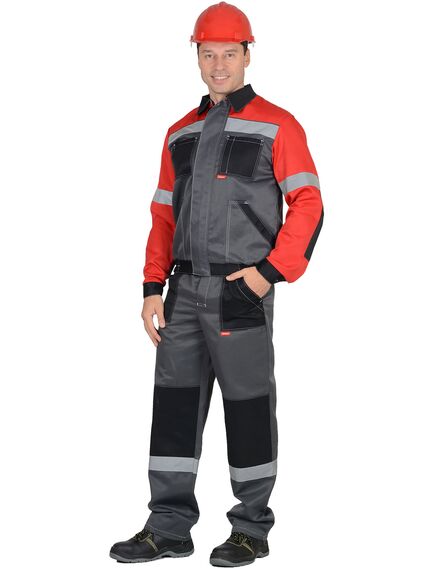 Костюм состоит из куртки и брюк.Куртка короткая с центральной застежкой на молнию; с ветрозащитной планкой, с отложным воротником, с верхними и нижними накладными карманами. Рукава с притачными манжетами.Светоотражающие полосы шириной 50мм по спинке полочкам и рукавам, обеспечивают безопасность работы в условиях пониженной видимости. Брюки прямые с притачным поясом, с застёжкой гульфика на пуговицы, с двумя накладными боковыми карманами. Светоотражающие полосы шириной 50мм по низу брюк обеспечивают безопасность работы в условиях пониженной видимости.