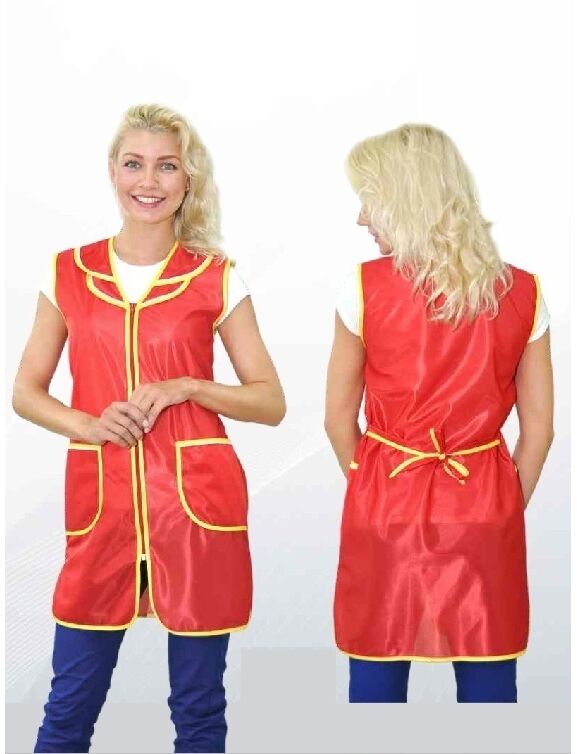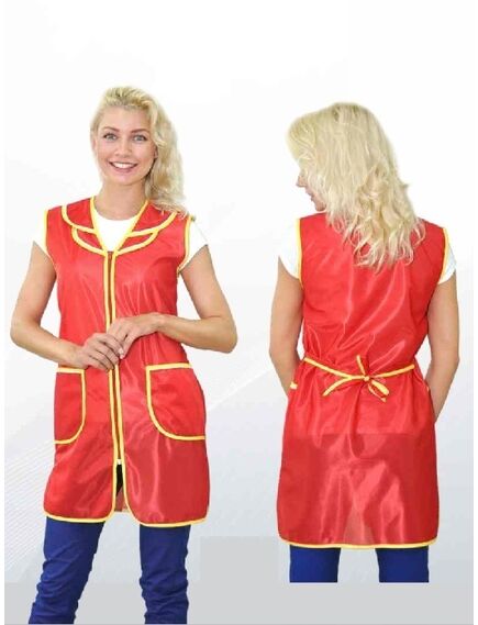 Сарафан женский укороченный прямого силуэта с центральной застежкой на молнию и горловиной с V-образным вырезом. Верхний срез боковых карманов и фигурные полуворотники декорированы контрастным кантом. Спинка без отделки, объем талии регулируется полупоясами. Все срезы сарафана обработаны износостойким нейлоновым кантом. Сарафан предназначен для защиты от общепроизводственных загрязнений.