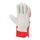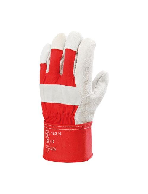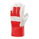 Перчатки из серого спилка воловьей кожи и красной ткани. Подкладка – из мягкого натурального хлопка.