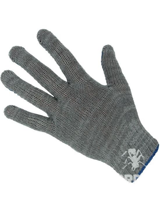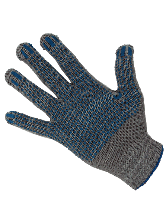 Перчатки кругловязаные х/б с точечным ПВХ-покрытием наладонника, серого цвета. Характеризуются стандартной плотностью вязки – 7,5 петель на дюйм (2-3 нити), 7 класс вязки. Перчатки х/б безвредны для кожи рук, отличаются комфортностью использования: не стесняют движений пальцев рук, благодаря свободному воздухообмену не допускают запотевания рук. Специальное полимерное покрытие (ПВХ) обеспечивает дополнительную стойкость изделия к истиранию и защиту от скольжения, создает более устойчивое сцепление пальцев рук с деталями и предметами. Рекомендуются к использованию при проведении точных механосборочных работ, связанных с необходимостью надежного захвата детали, инструмента, предмета. Перчатки надежно предохраняют руки от загрязнения, механических повреждений острыми углами, арматурой и т.д.