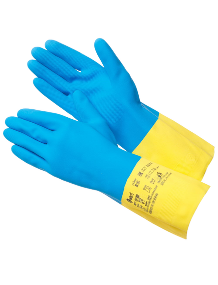 Двухцветная перчатка из натурального латекса с добавлением неопрена (усиливает химическую стойкость). Текстурированное покрытие ладони и пальцев, хлопковое покрытие внутри. Перчатки имеют допуск к пище и могут применяться на предприятиях общественного питания.