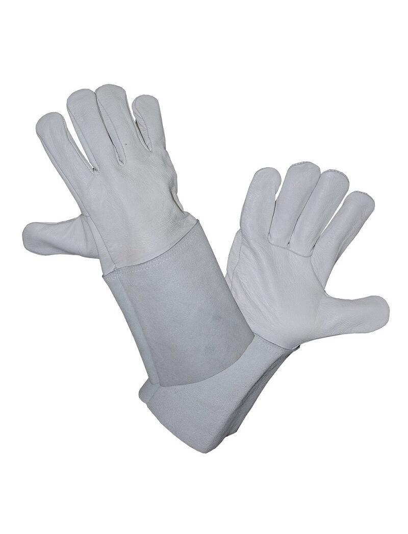 Эти перчатки полностью изготовлены из кожи. Cпилок (манжет 14 см) сочетается с цельнозерновой козьей кожей (длина 1 см). Перчатки, закрывающие всю ладонь, выполнена из цельного куска высококачественной кожи, перепончатый большой палец. Перчатки более прочные и устойчивые к истиранию - в том числе манжета из спилка (общая длина перчатки 33 см), предохраняющая от намокания и предохраняющая запястье от травм - используются в местах, где есть риск возникновения искр - широко используются для общих механических работ, в строительстве, тяжелой промышленности, а также для работы с ручным и электроинструментом, на складах