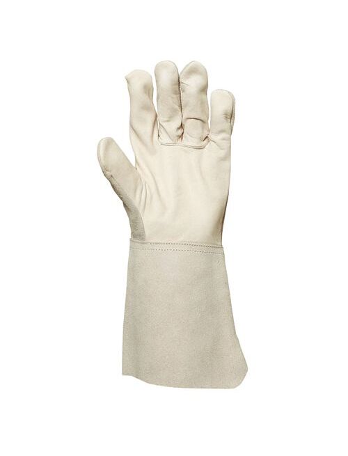 Ладонь выполнена из цельнозерновой телячьей кожи, а тыльная сторона и манжеты – из спилка. Поэтому перчатки: