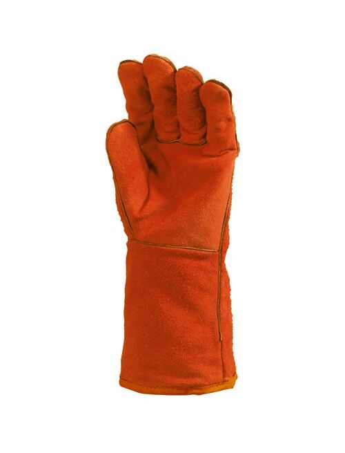Сварочные перчатки полностью изготовлены из спилка яловой кожи красного цвета. Для большей прочности все швы усилены кевларовой нитью.