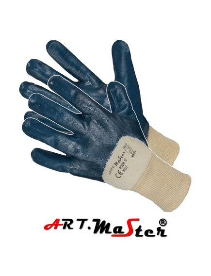 Защитные перчатки, выполненные из хлопкового бежевого вязаного трикотажа. Покрытые нитрилом: захватная часть целиком и наполовину верхняя часть, нитриловое покрытие синего цвета с высокой износостойкостью. Завершено эластичной резинкой. Перчатки прочные, гибкие, стойкие к истиранию. Плотно прилегают к руке, обеспечивают удобство и плотное сцепление с предметами и поверхностями. Нитрил устойчив к маслам, смазкам, растворителям, уменьшает попадание грязи. Покрытие сохраняет целостность даже при намеренно сильном растяжении, не отслаивается и сохраняет свои характеристики на протяжении всего срока эксплуатации.